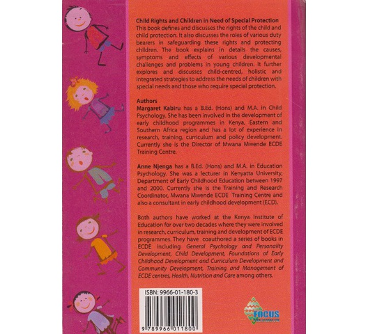 This book defines and discusses the rights of the child and child protection. It also discusses the roles of various duty bearers in safeguarding these rights and protecting children. The book explains in details the causes, symptoms and effects of various developmental challenges and problems in young children. It further explores and discusses child-centred, holistic and integrated strategies to address the needs of children with special needs and those who require special protection.
