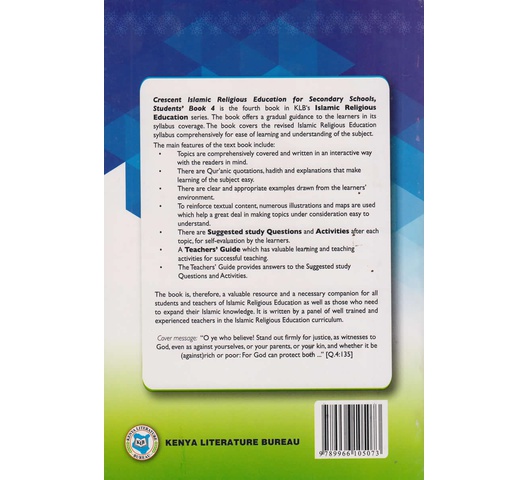 Crescent Islamic Religious Education for Secondary Schools, Students’ Book 4 is the first book in KLB’s Islamic Religious Education series. The book offers a gradual guidance to the learners in syllabus coverage. The book covers the revised Islamic Religious Education syllabus comprehensively for ease of learning and understanding of the subject The main features of the text book include:
