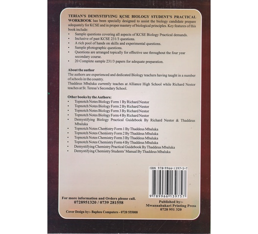 TERIAN’S DEMYSTIFYING KCSE BIOLOGY STUDENT’S PRACTICAL WORKBOOK has been specially designed to assist the biology candidate to prepare adequately for KCSE and in the proper mastery of biological principles. Key features of this book include: