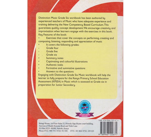 Distinction Music Grade Six workbook has been authored by experienced teachers of Music who have adequate experience and training delivering the New Competency Based Curriculum. This guarantees quality concept development. We encourage creativity and improvisation when learners engage with the exercises in this book.