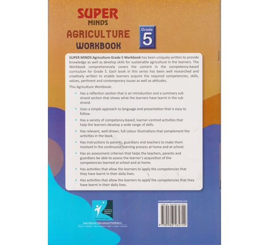 SUPER MINDS Agriculture Grade 5 Workbook has been uniquely written to provide knowledge as well as develop skills for sustainable agriculture in the learners. The Workbook comprehensively covers the content in the competency-based curriculum for Grade 5. Each book in this series has been well researched and creatively written to enable learners to acquire the required competencies, skills, values, pertinent and contemporary issues as well as attitudes.