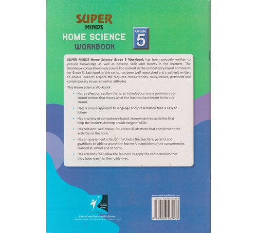 SUPER MINDS Home Science Grade 5 Workbook has been uniquely written to provide knowledge as well as develop skills and talents in the learners. The Workbook comprehensively covers the content in the competency-based curriculum for Grade 5. Each book in this series has been well researched and creatively written to enable learners to acquire the required competencies, skills, values, pertinent and contemporary issues as well as attitudes.