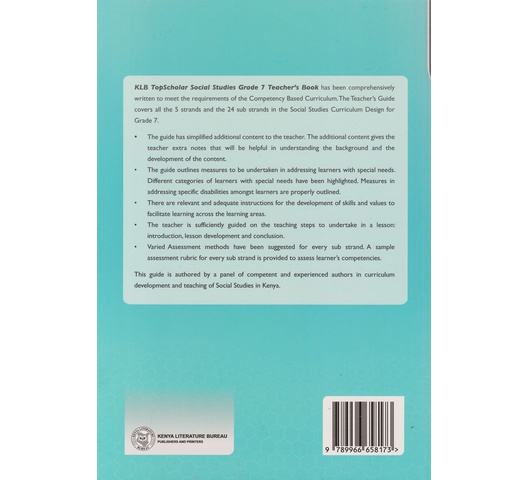 KLB TopScholar Social Studies Grade 7 Teacher’s Book has been comprehensively written to meet the requirements of the Competency Based Curriculum. The Teacher’s Guide covers all the 5 strands and the 24 sub strands in the Social Studies Curriculum Design for Grade 7.