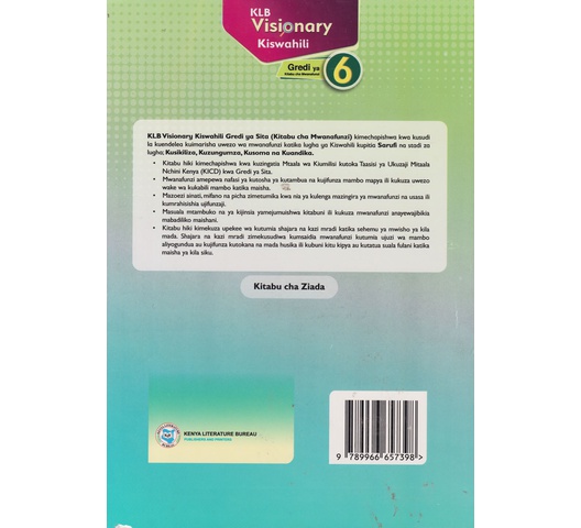 KLB Visionary Kiswahili Gredi ya Sita (Kitabu cha Mwanafunzi) kimechapishwa kwa kusudi la kuendelea kuimarisha uwezo wa mwanafunzi katika lugha ya Kiswahili kupitia Sarufi na stadi za lugha; Kusikiliza, Kuzungumza, Kusoma na Kuandika.