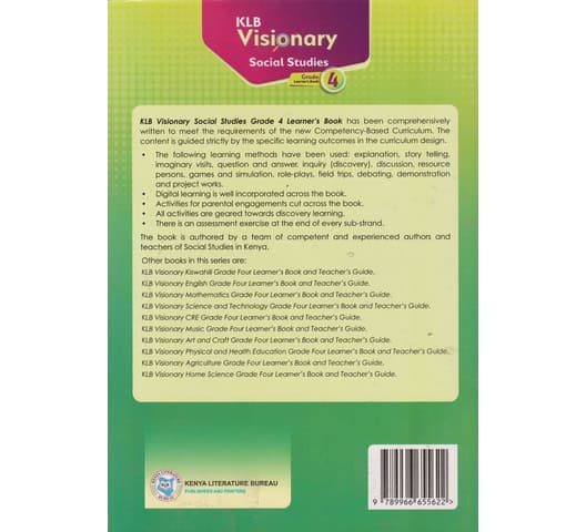KLB Visionary Social Studies Grade 4 Learner’s Book has been comprehensively written to meet the requirements of the new Competency-Based Curriculum. The content is guided strictly by the specific learning outcomes in the curriculum design.
