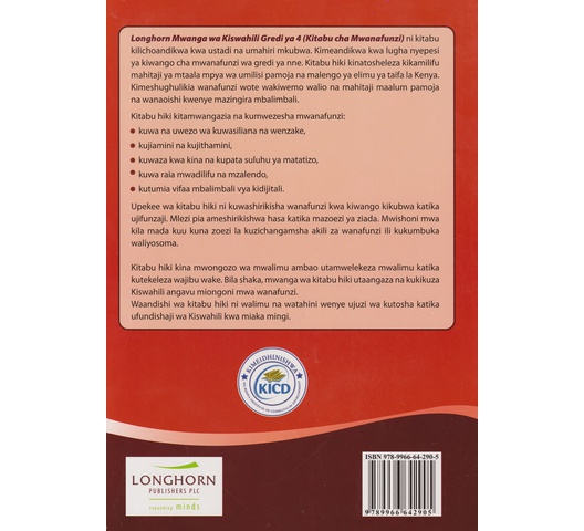Longhorn Mwanga wa Kiswahili Gredi ya 4 (Kitabu cha Mwanafunzi) ni kitabu kilichoandikwa kwa ustadi na umahiri mkubwa. Kimeandikwa kwa lugha nyepesi ya kiwango cha mwanafunzi wa gredi ya nne. Kitabu hiki kinatosheleza kikamilifu mahitaji ya mtaala mpya wa umilisi pamoja na malengo ya elimu ya taifa la Kenya. Kimeshughulikia wanafunzi wote wakiwemo walio na mahitaji maalum pamoja na wanaoishi kwenye mazingira mbalimbali.