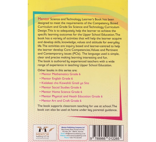 Mentor Science and Technology Learner’s Book has been designed to meet the requirements of the Competency BasedCurriculum and Grade Six Science and Technology Curriculum Design. This is to adequately help the learner to achieve thespecific learning outcomes for the Upper School Education. Thebook has a variety of activities that will help the learner acquire and develop skills, knowledge, values and attitude for everydaylife. The activities are inquiry based and learner-centred to help the learner develop Core Competencies, Values and Pertinent and Contemporary issues (PCls). The language used is simple,clear and precise making learning interesting and fun.The book is authored by experienced teachers with a wide range of experience in teaching Upper School Education.