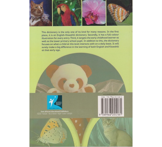 This dictionary is the only one of its kind for many reasons. In the first place, it is an English-Kiswahili dictionary. Secondly, it has a full-colour illustration for every entry. Third, it targets the early childhood learner as well as the lower primary school pupil. In addition to this, the dictionary focuses on what a child at this Level interacts with on a daily basis. It will surely make a big difference in the learning of both English and Kiswahili at that early age.