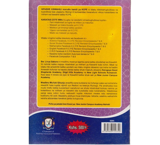 NIPASHE KISWAHILI marudio kamili ya KCPE ni kitabu kilichoshughulikiwa na kuandikwa kwa utaalamu Mwingi ili kumwandaa mwanafunzi vilivyo kukabiliana na mtihani wa kiswahili katika KCPE.KARATASI ZOTE MBILI (Lugha na Uandishi) zimeshughulikiwa kupitia:-