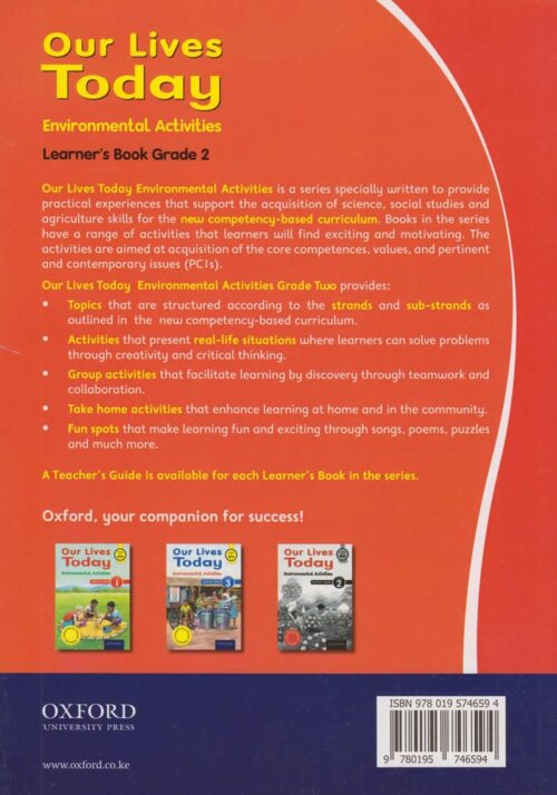 Our Lives Today Environmental Activities is a series specially written to provide practical experiences that support the acquisition of science, social studies and agriculture skills for the new competency-based curriculum. Books in the series have a range of activities that learners will find exciting and motivating. The activities are aimed at the acquisition of the core competencies, values, and pertinent and contemporary issues (PC’s).