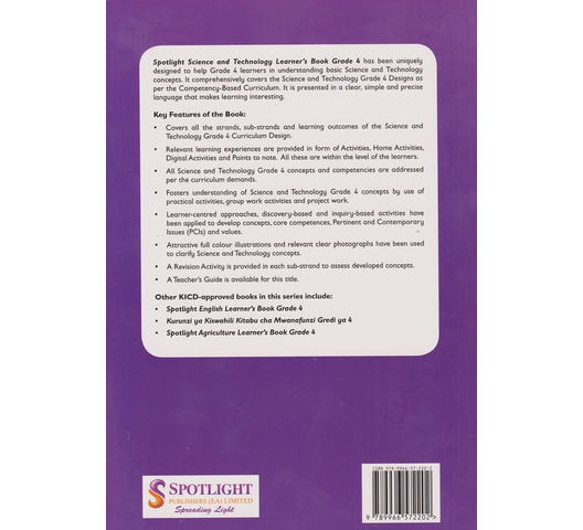 Spotlight Science and Technology Learner’s Book Grade 4 has been uniquely designed to help Grade 4 learners in understanding basic Science and Technology concepts. It comprehensively covers the Science and Technology Grade 4 Designs as per the Competency-Based Curriculum. It is presented in a clear, simple and precise language that makes learning interesting.