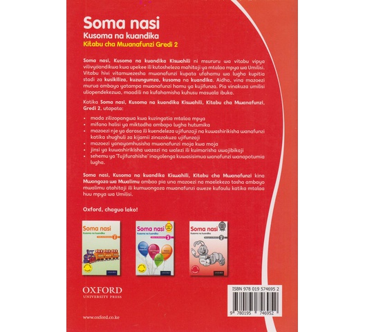 Soma nasi, Kusoma na kuandika Kiwiahili ni msururu wa vitabu vipya vitivyoandikwa kwa upekee iii kutosheleza mahitaji ya mtataa mpya wa Umilisi. Vitabu hivi vitamwezesha mwanafunzi kupata ufahamu wa lugha kupitia stadi za kusikiliza, kuzungumza. kusoma no kuandika. Aidha, vina mazoezi murua ambayo yatampa mwanafunzi hamu ya kujifunza. Pia vinakuza umilisi utiopendekezwa, maaditi na kufahamisha kuhusu masuala ibuka. Katika Soma nasi, Kusoma na kuandika Kiswahili, Kitabu cha Muranafunzl, Gredi 2, utapata: