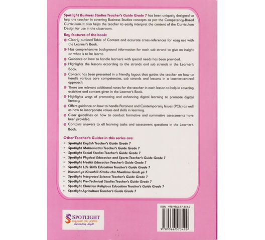 Spotlight Business Studies Teacher’s Guide Grade 7 has been uniquely designed to help the teacher in covering Business Studies concepts as per the Competency-Based Curriculum. It also helps the teacher to easily interpret the content of the Curriculum Design for use in the classroom.