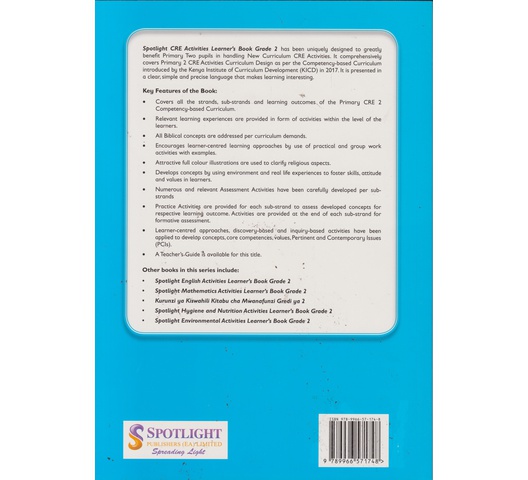 potlight CRE Activities Learner’s Book Grade 2 has been uniquely designed to greatly benefit Primary Two pupils in handling New Curriculum CRE Activities. It comprehensively covers Primary 2 CRE Activities Curriculum Design as per the Competency-based Curriculum introduced by the Kenya Institute of Curriculum Development (KICD) in 2017. It is presented in a clear, simple, and precise language that makes learning interesting.