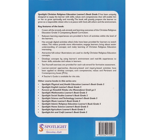 Spotlight Christian Religious Education Learner’s Book Grade 5 has been uniquely designed to equip the learner with skills, values and competencies that will enable him or her to grow spiritually and morally. The book will greatly prepare the learner to grow as a responsible citizen who is at peace with God, self, others and the environment.
