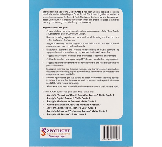 Spotlight Music Teacher’s Guide Grade 5 has been uniquely designed to greatly benefit the teacher in handling the Grade 5 Music Curriculum. It guides the teacher to comprehensively cover the Grade 5 Music Curriculum Design as per the CompetencyBased Curriculum. It is presented in a clear, simple, and precise language that makes teaching and learning both stimulating and interesting.