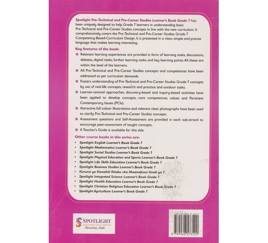Spotlight Pre-Technical and Pre-Career Studies Learner’s Book Grade 7 has been uniquely designed to help Grade 7 learners in understanding basic Pre-Technical and Pre-Career Studies concepts in line with the new curriculum. It comprehensively covers the Pre-Technical and Pre-Career Studies Grade 7 Competency-Based-Curriculum Design. It is presented in a clear, simple and precise language that makes learning interesting.