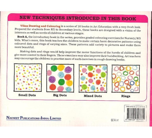 Vikas Drawing and Colouring is a series of 10 books in Art Education with a very fresh look. Prepared for students from KG to Secondary levels, these books are designed with a vision of the interests as well as needs of children at various stages. Book A, the introductory book in the series, provides graded colouring exercises for Nursery/ KG kids. What’s more, this book teaches the children to make certain basic decorative patterns using coloured dots and rings of varying sizes. These patterns add variety to pictures and make them more beautiful. Making dots and rings would help improve the motor functions of the hands of children and give more control to their fingers. These exercises may also improve their handwriting. Art teachers may encourage the children to practise more of such exercises in rough drawing books.